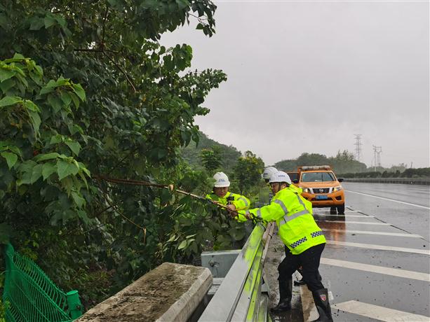 紹興管理中心堅持關(guān)口前移、人員下沉,開啟24小時值守模式,已有80余名黨員干部和黨團員志愿者駐守在防臺第一線。工作人員第一時間搶抓時間對轄區(qū)路段進行全面排查,全面掌握積水路段、沿線邊坡、路側(cè)綠化、標志標牌、應(yīng)急物資等情況,確保人員值守、隱患排查、物資儲備“三到位”。在杭甬高速紹興段,工作人員重點清理沽渚樞紐、曹娥江大橋等區(qū)域橋下空間堆積物,共清理浮游垃圾、藤蔓約1.2噸;在上三高速上虞至天臺段、甬金高速金華段,工作人員清理公路兩側(cè)易倒伏綠化樹木共53棵;此外,工作人員對15處易堵塞排水溝淤泥、枯枝進行清理,將3.6公里范圍的路側(cè)雜草予以鏟除,確保排水暢通,路面無積水。截至13日下午2點,管理中心15支應(yīng)急救援隊、297人應(yīng)急搶險隊伍整裝待命,防臺物資若干,充分做好防臺各項后勤保障工作。