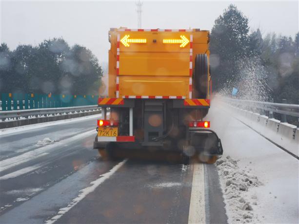 為積極應(yīng)對此輪冰雪寒潮天氣,公司轄區(qū)共儲備有吹雪車19輛、推(鏟)雪車96輛、灑布車138輛,儲備融雪劑1432.5噸、防滑砂石2230噸、麻草袋24980只。通過專項檢查、沙盤推演等方式,全方位、多角度對防寒潮應(yīng)對準(zhǔn)備工作進行再檢查、再完善,確保人員力量、設(shè)備物資、應(yīng)急預(yù)案到位,關(guān)鍵時刻拉得出、用得上、打得贏。進一步加強對杭徽、臨建、申蘇浙皖、上三新天段、甬金紹興段等易結(jié)冰重點路段的巡查力度,密切關(guān)注路面溫度,及時撒鋪融雪劑,確保道路安全暢通。