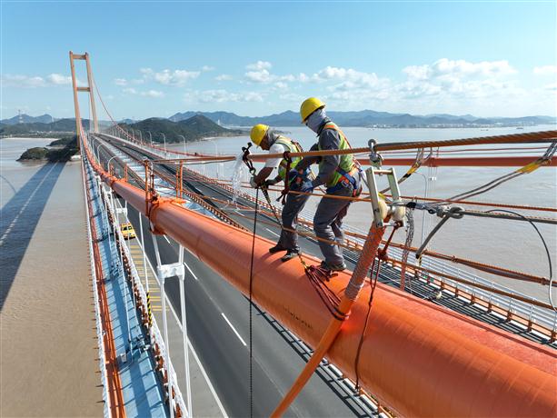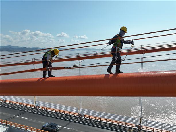 橙色“絲帶”,為主纜穿上新“鎧甲”