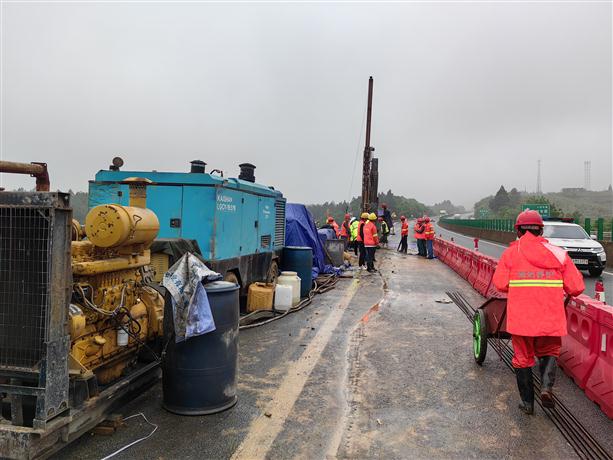 邊坡滑塌地質(zhì)災(zāi)害事件發(fā)生后,永藍(lán)公司果斷對滑塌路段行車道和應(yīng)急車道采取臨時封閉措施,并第一時間邀請湖南省交通規(guī)劃勘察設(shè)計院專家團(tuán)隊(duì)現(xiàn)場辦公, 經(jīng)反復(fù)論證形成臨時應(yīng)急搶險方案。一是采用微型鋼管樁加固。在滑塌路段應(yīng)急車道打3排微型鋼管樁并壓漿進(jìn)行緊急加固處理,微型鋼管樁下埋12米,總加固長度為2000米,預(yù)計5月10日前完成。二是加強(qiáng)防滲水處理。及時對滑塌損壞的邊坡坡面及路面排水系統(tǒng)進(jìn)行修復(fù), 同時對滑塌路段坡面雜草和灌木進(jìn)行清理,并使用防水雨布對坡面進(jìn)行全覆蓋。三是坡腳反壓防護(hù)。為防止臨空面再出現(xiàn)坍塌,在坡腳采取片石反壓。四是落實(shí)動態(tài)實(shí)時監(jiān)測。已安裝2臺視頻云監(jiān)控設(shè)備,對現(xiàn)場情況進(jìn)行實(shí)時監(jiān)控。采購并安裝4套GNSS地表三維動態(tài)監(jiān)測儀,動態(tài)掌握滑坡體沉降、位移等實(shí)時數(shù)據(jù),并建立預(yù)警閥值。同時安排技術(shù)人員24小時值守,不間斷監(jiān)測病害發(fā)展趨勢,出現(xiàn)異常情況第一時間升級交通管制措施。
